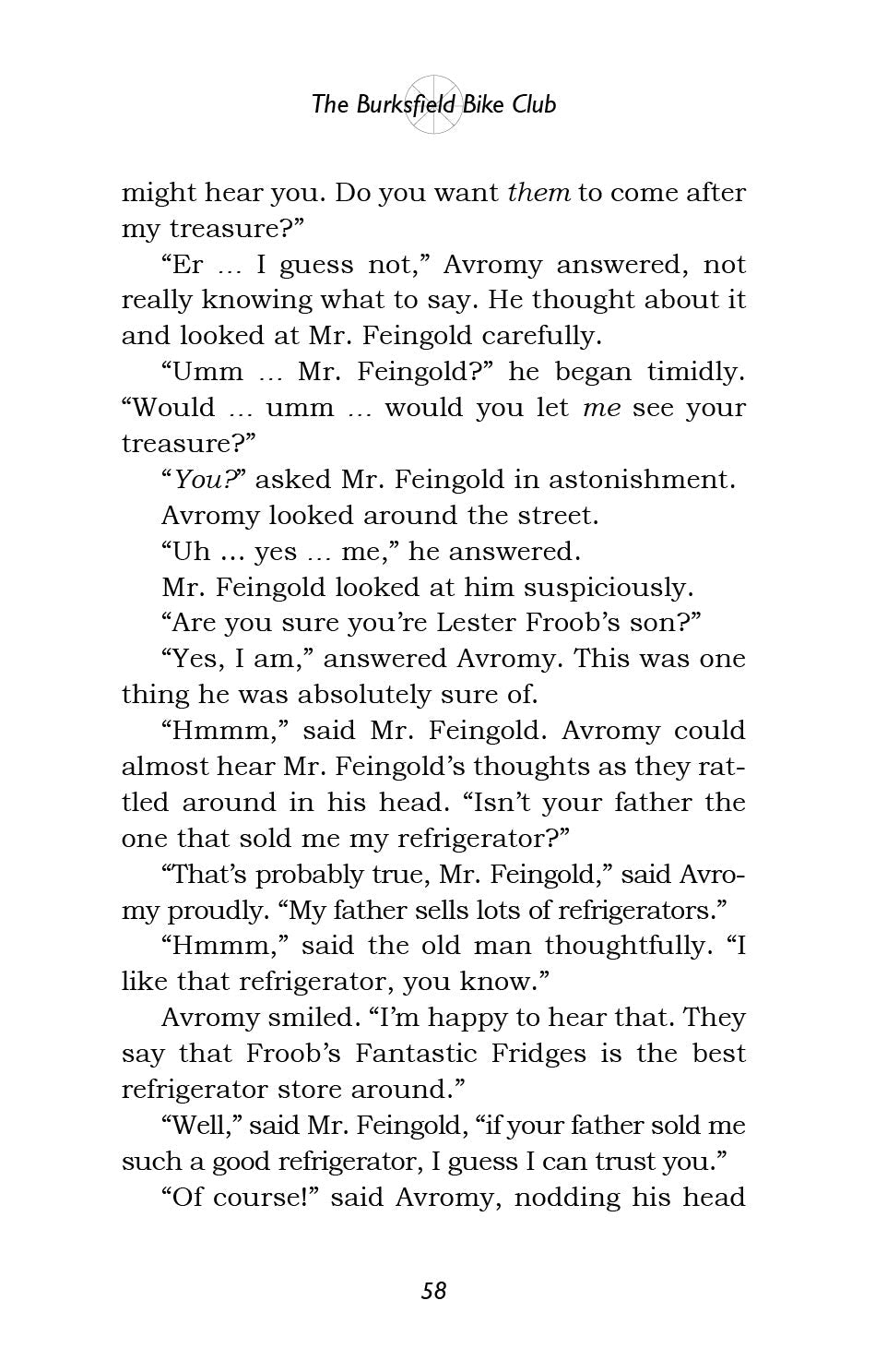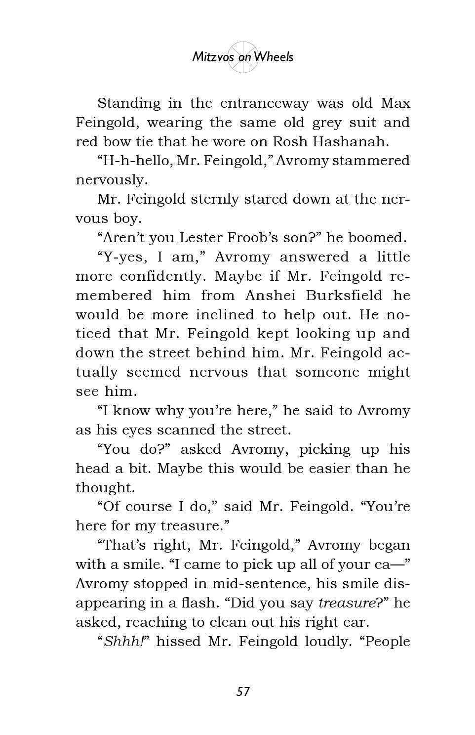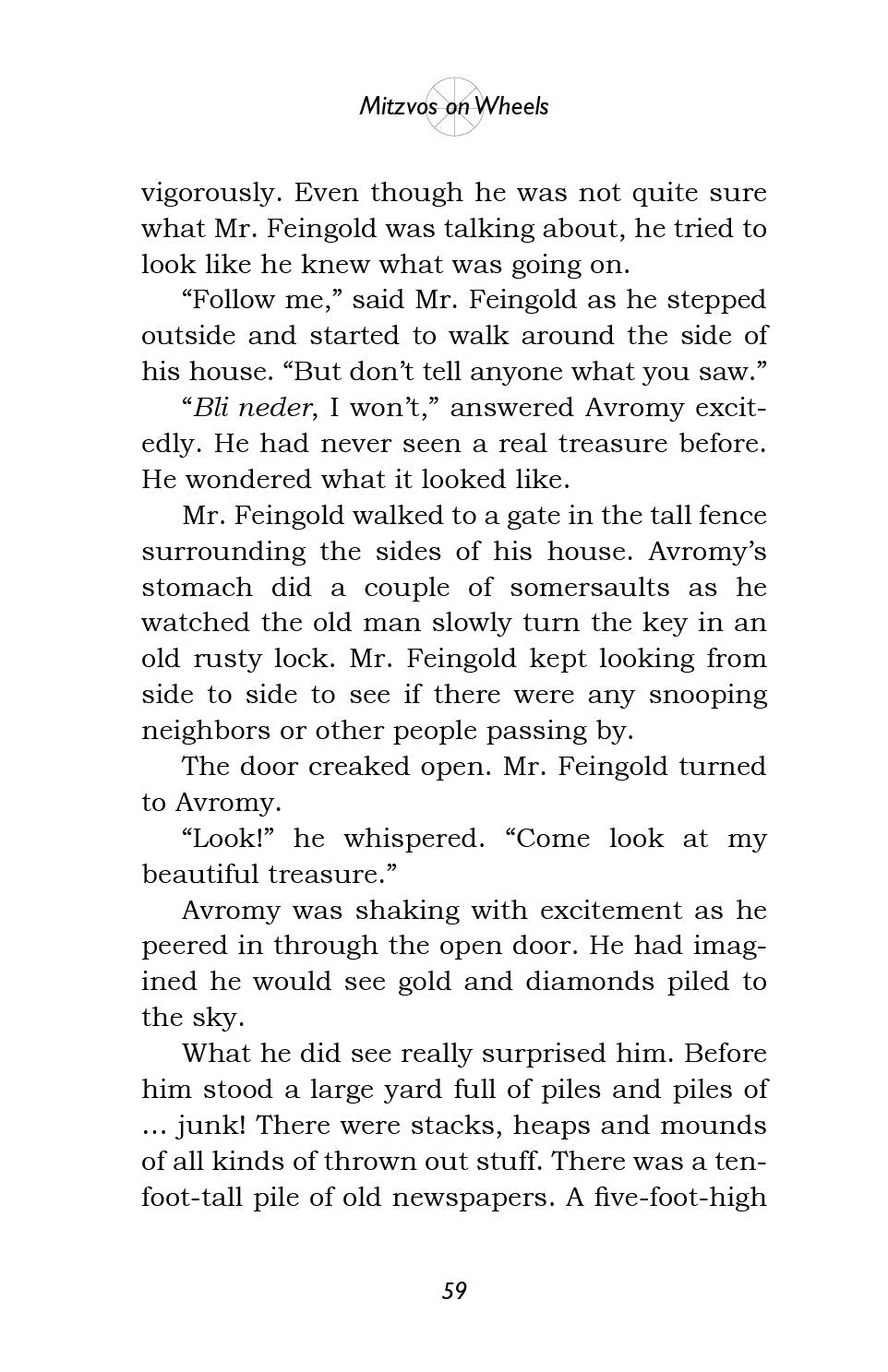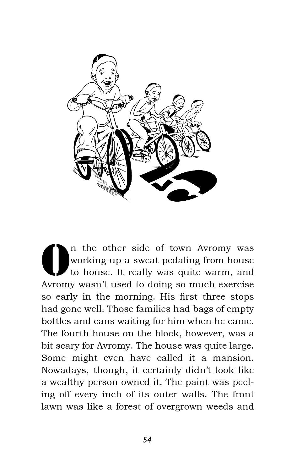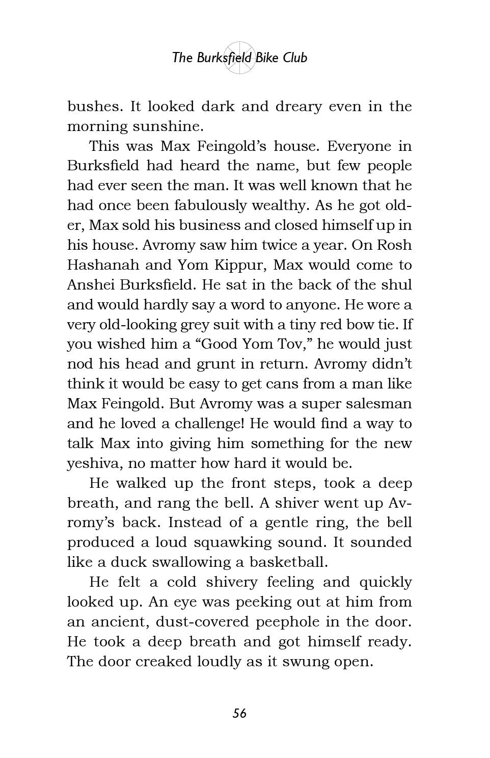 So begins the Burksfield Bike Club, and before you know it ... they're off! Avi, Moish, Eli and Avromy find out that Rabbi Goldenberg urgently needs money to start a yeshiva for new immigrants, and they immediately set out to help him. Using a combination of their brains and their bikes, they start a chain reaction of mitzvos that turns the sleepy little town of Burksfield upside down!