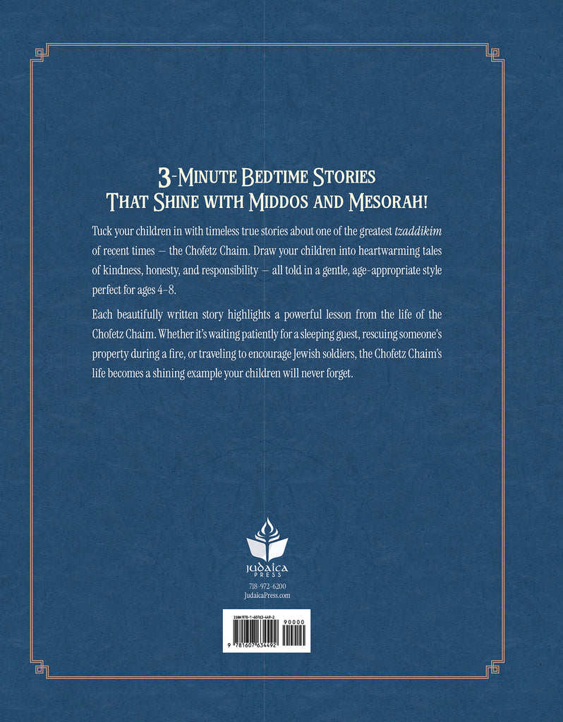 Tuck your children in with timeless true stories about one of the greatest tzaddikim of recent times -- the Chofetz Chaim. Draw your children into heartwarming tales of kindness, honesty, and responsibility -- all told in a gentle, age-appropriate style perfect for ages 4–8.