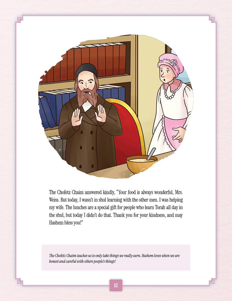 Each beautifully written story highlights a powerful lesson from the life of the Chofetz Chaim. Whether it’s waiting patiently for a sleeping guest, rescuing someone's property during a fire, or traveling to encourage Jewish soldiers, the Chofetz Chaim’s life becomes a shining example your children will never forget.