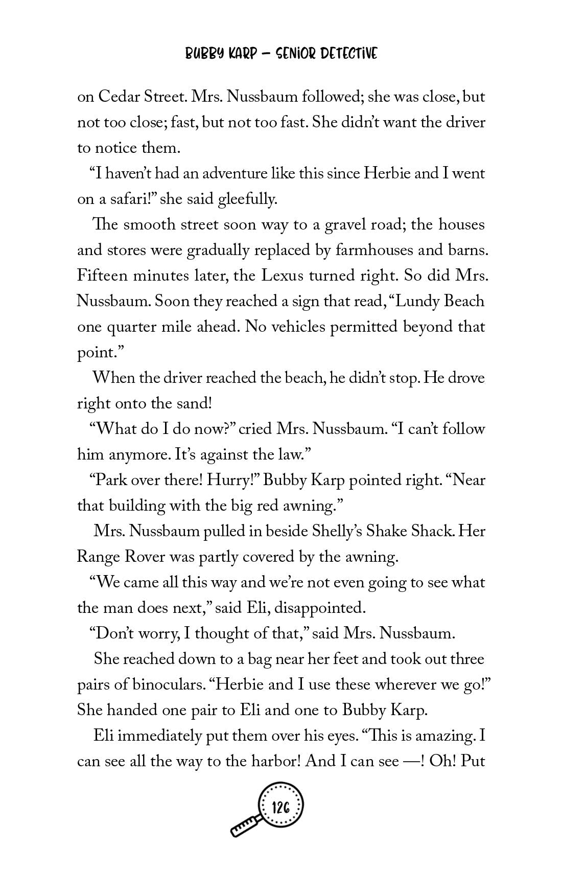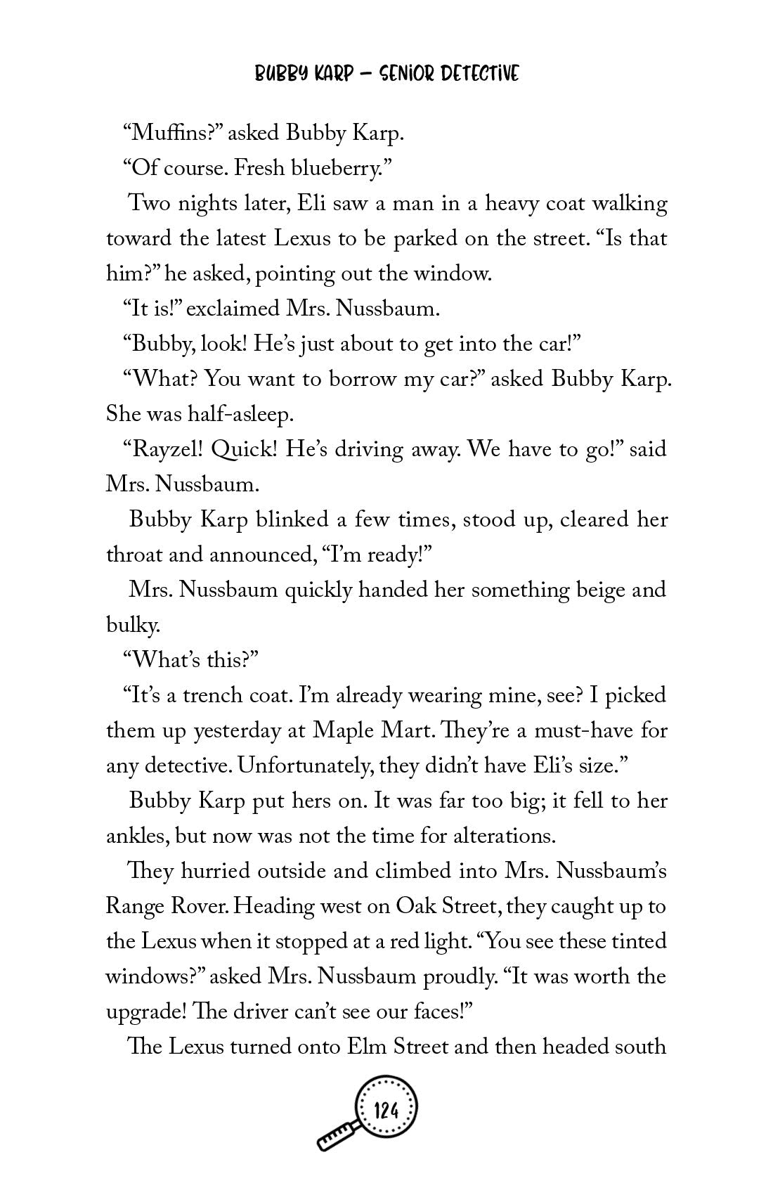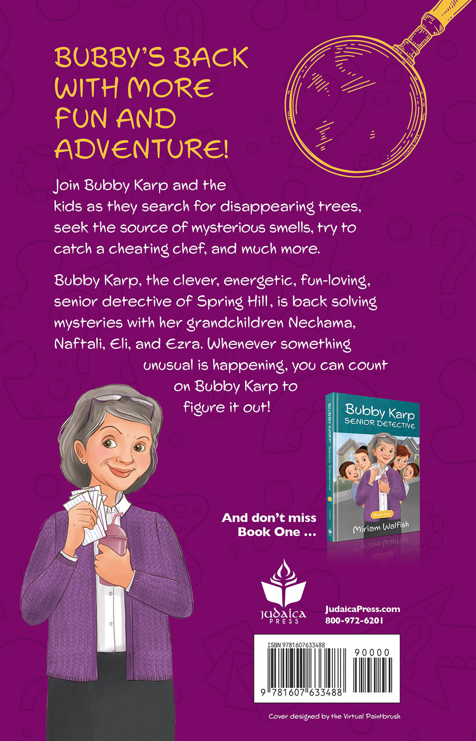 Bubby Karp, the clever, energetic, fun-loving, senior detective of Spring Hill, is back solving mysteries with her grandchildren Nechama, Naftali, Eli, and Ezra. Whenever something unusual is happening, you can count on Bubby Karp to figure it out!