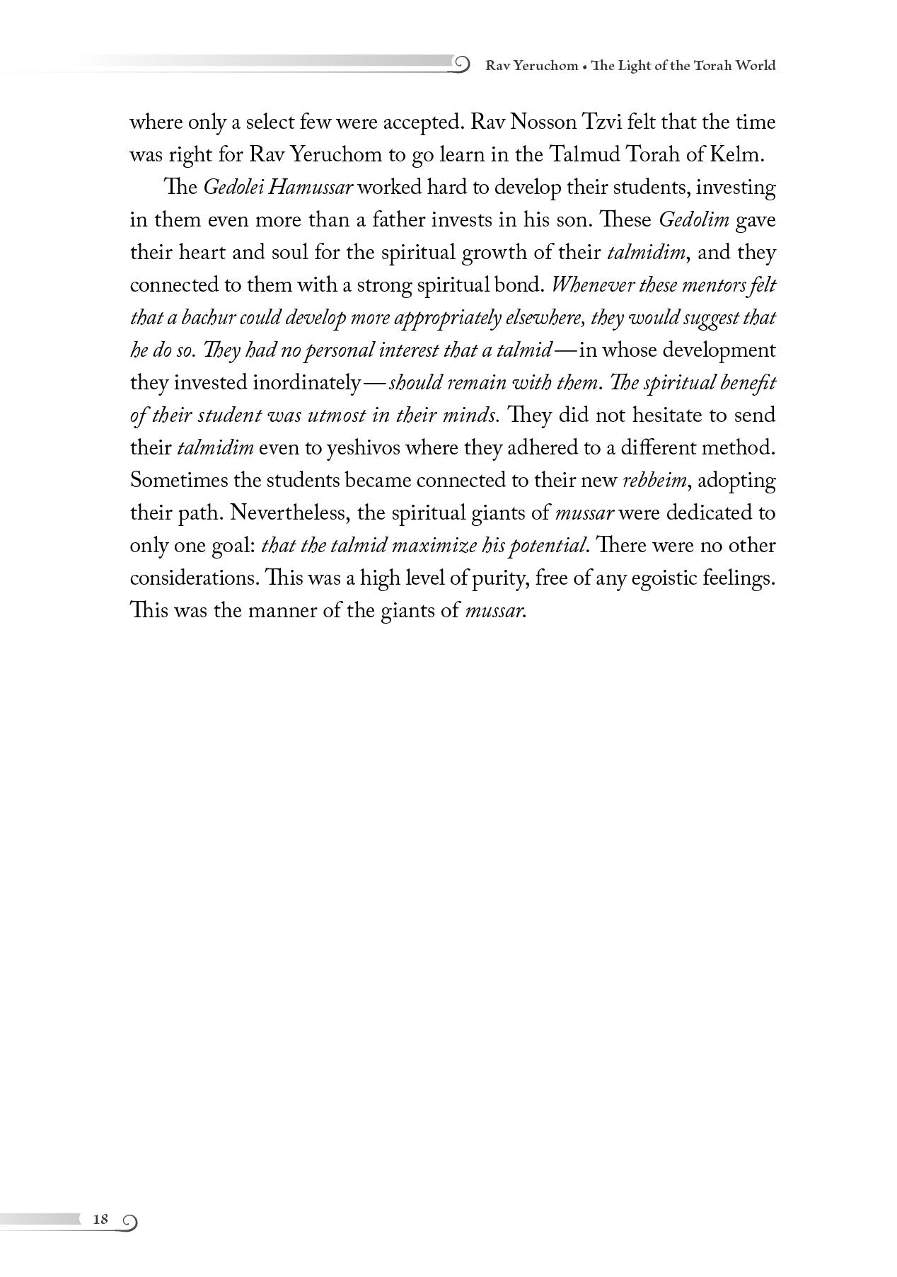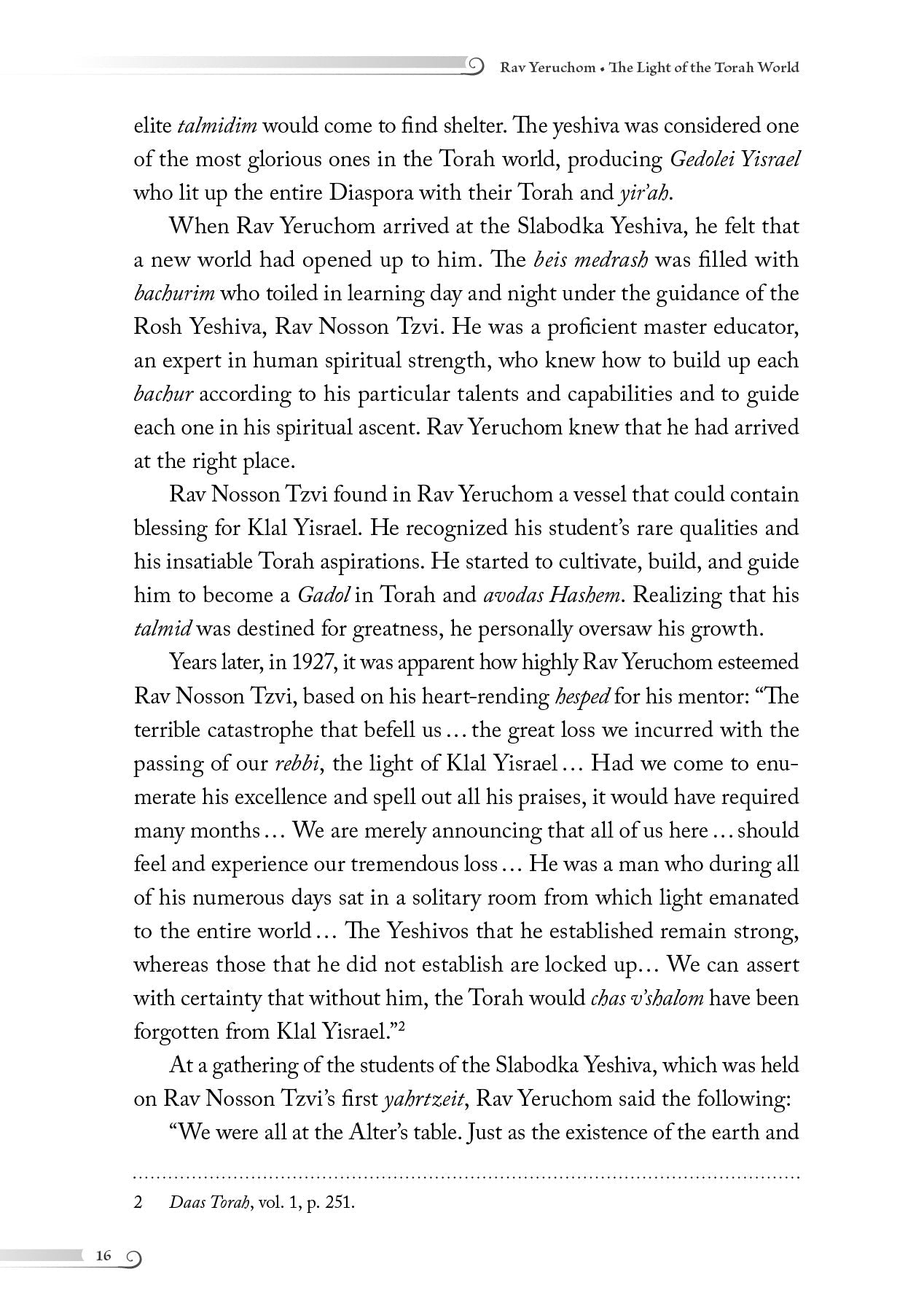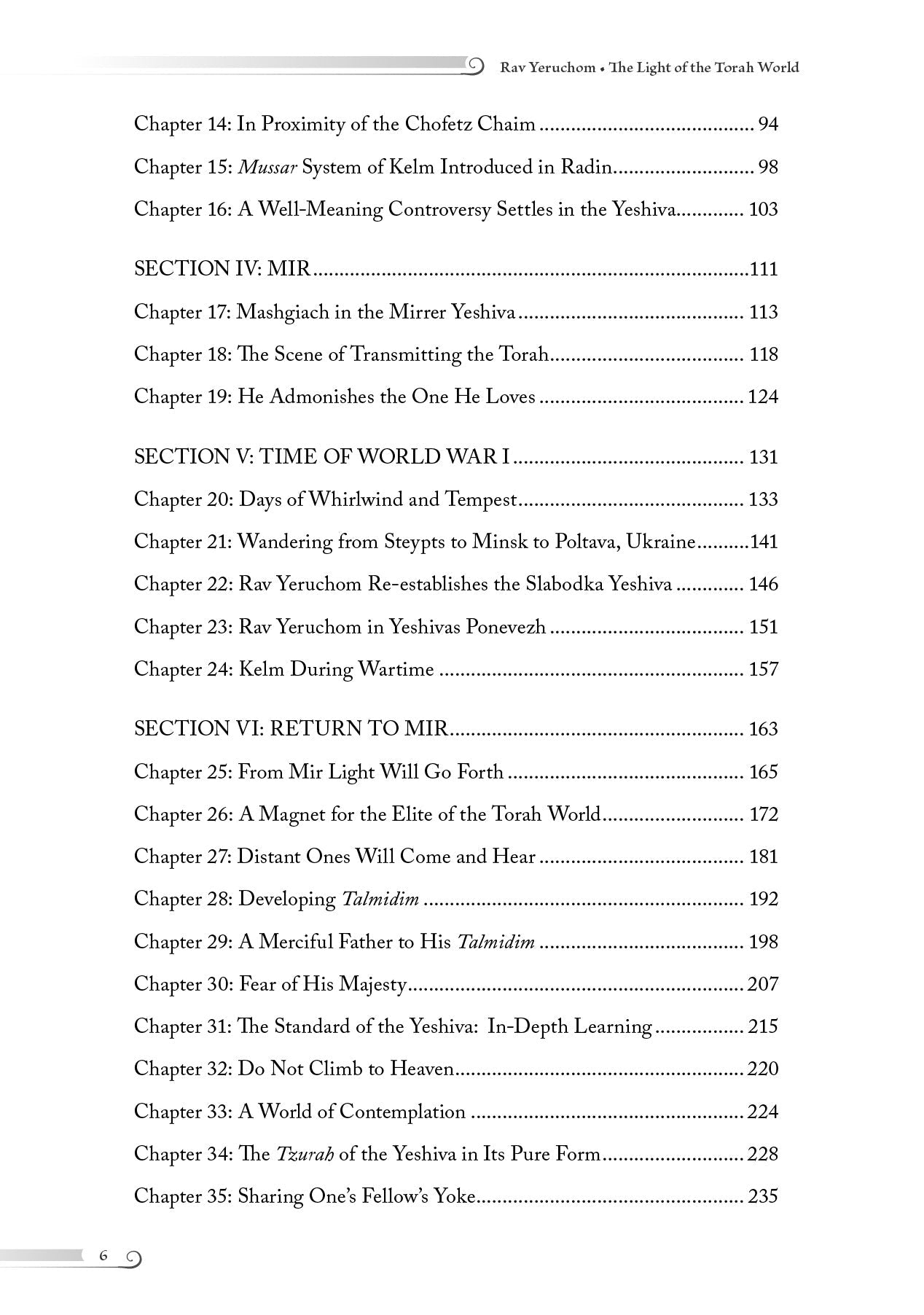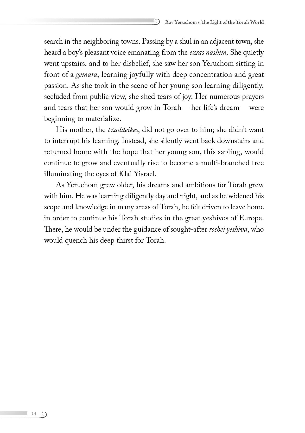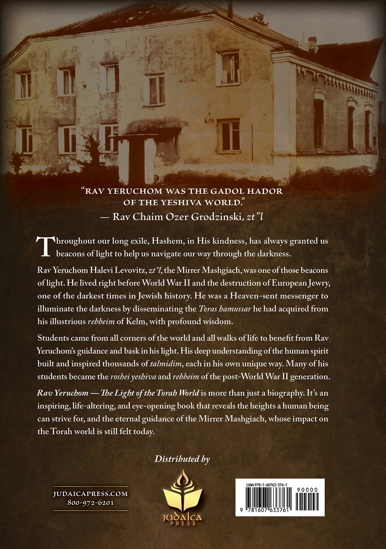 Rav Yeruchom — The Light of the Torah World is more than just a biography. It’s an inspiring, life-altering, and eye-opening book that reveals the heights a human being can strive for, and the eternal guidance of the Mirrer Mashgiach, whose impact on the Torah world is still felt today.