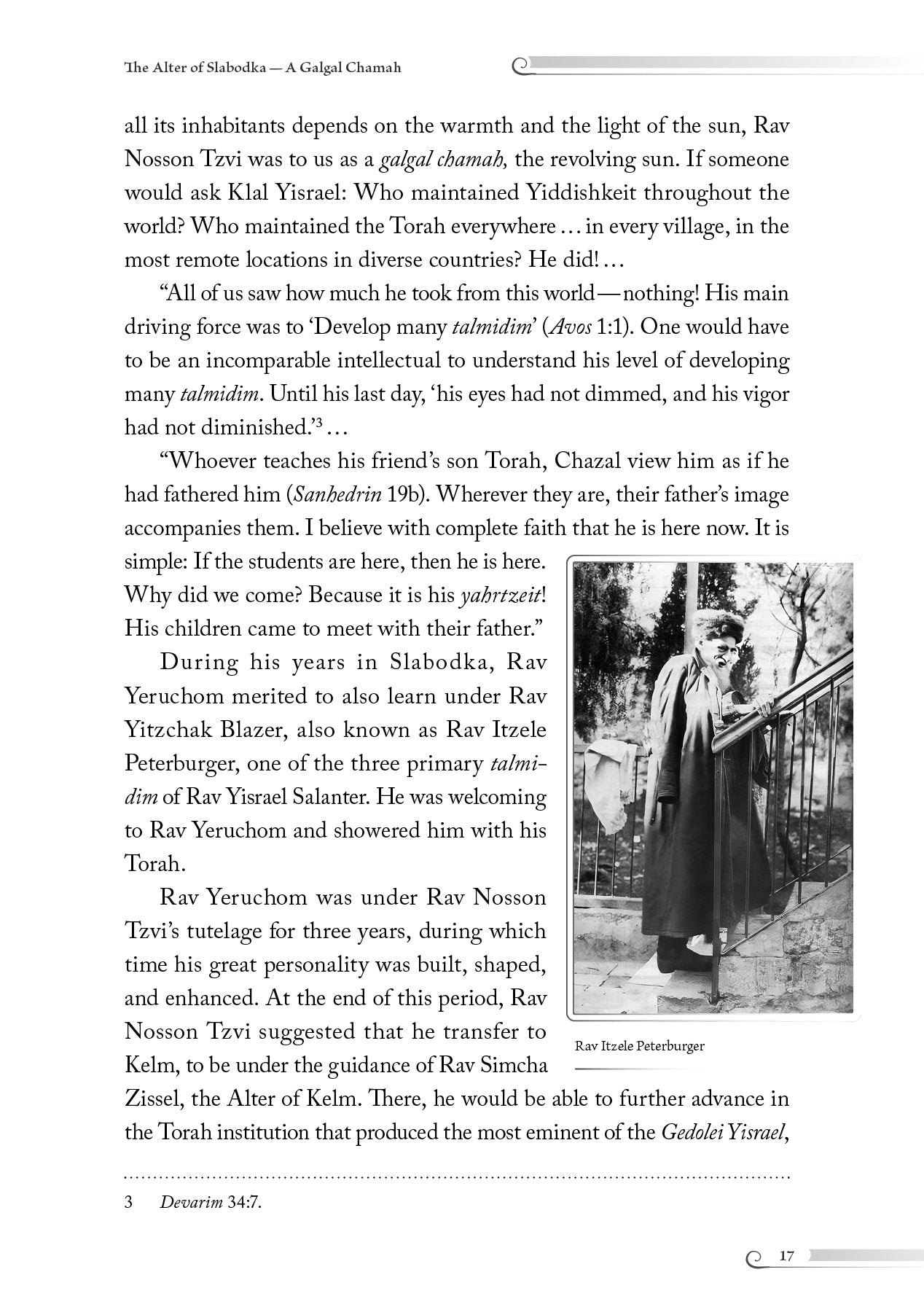 Rav Yeruchom Halevi Levovitz, zt”l, the Mirrer Mashgiach, was one of those beacons of light. He lived right before World War II and the destruction of European Jewry, one of the darkest times in Jewish history. He was a Heaven-sent messenger to illuminate the darkness by disseminating the Toras hamussar he had acquired from his illustrious rebbeim of Kelm, with profound wisdom.