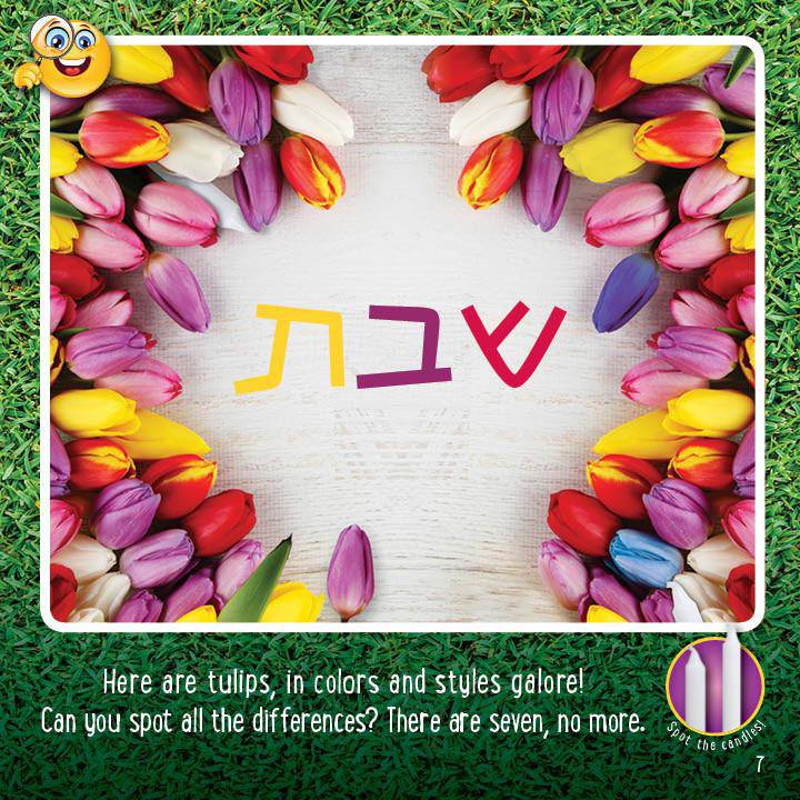 This bright and colorful photo book will keep kids busy as they try to spot differences between two similar pictures. There are 7 changes between each set of pictures, just like Shabbos is the 7th day of the week.