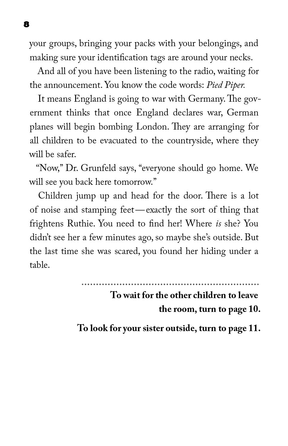 In this book, you, the reader, are the main character — and you make the decisions. You are a Jewish girl during World War II who escaped to England with your little sister. Now, you have just been told that your whole school must flee to the countryside, but your sister is nowhere to be found.
