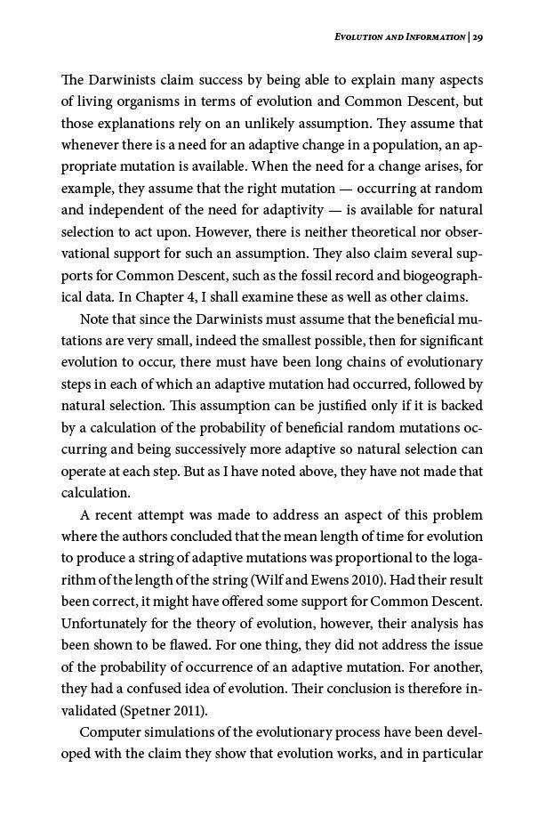 Not By Chance!, Dr. Lee Spetner, an MIT-trained physicist, presented compelling evidence that life on earth could not have developed through the random processes described by the theory of evolution. Prominent biologists and geneticists praised Dr. Spetner's book as one of the most serious challenges to evolutionary theory.