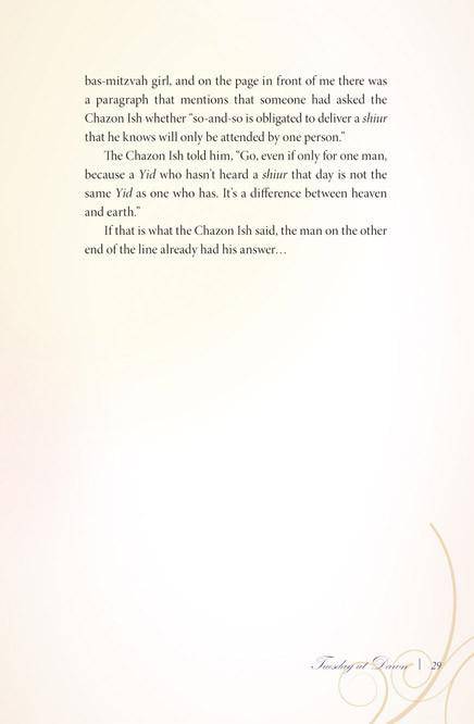 Since then, early every Tuesday morning, Mrs. Attias would sit next to the Rebbetzin, writing pad in hand, pen poised to transcribe her words. The Rebbetzin spoke and her eager student wrote. "Someday I am going to publish these stories," Mrs. Attias told her.